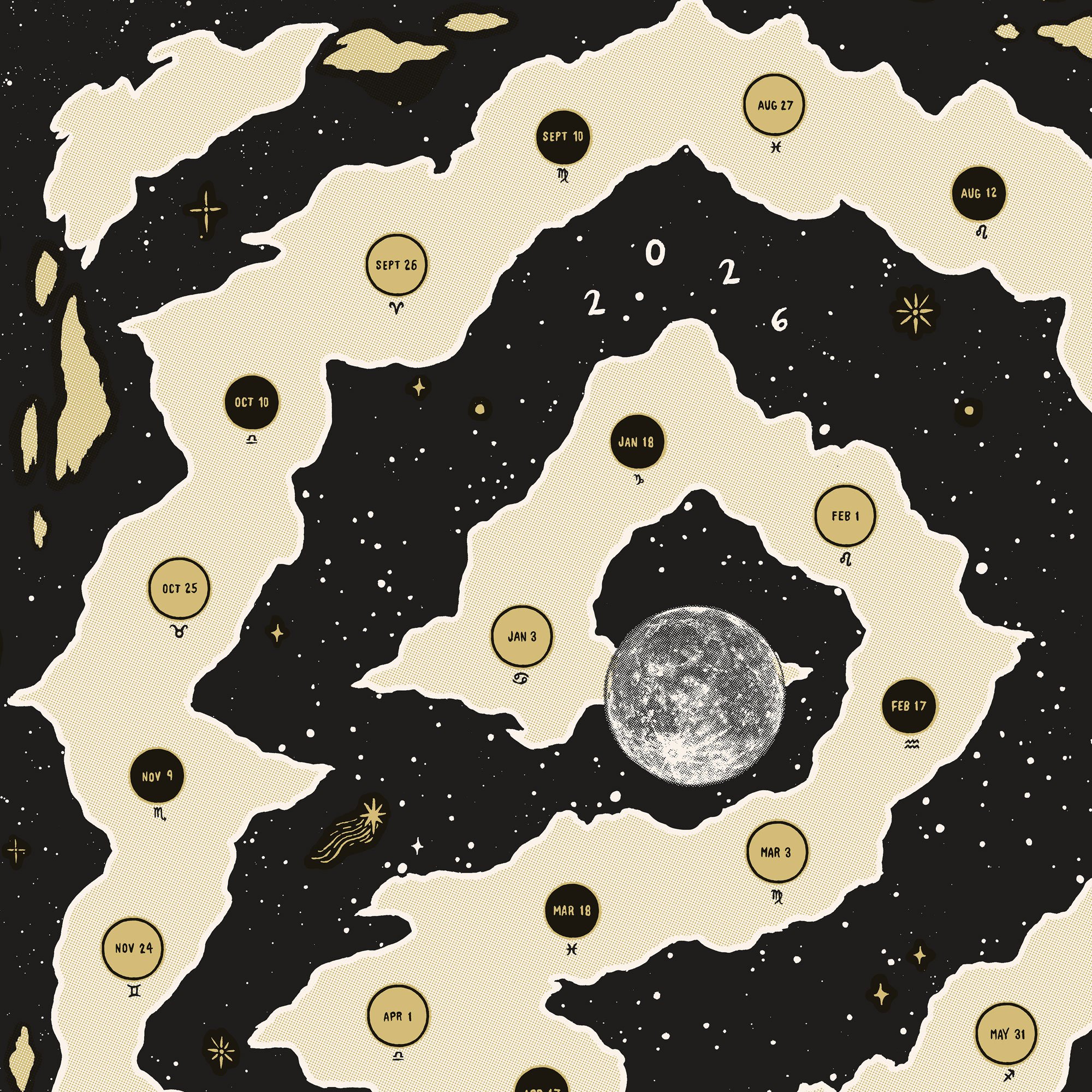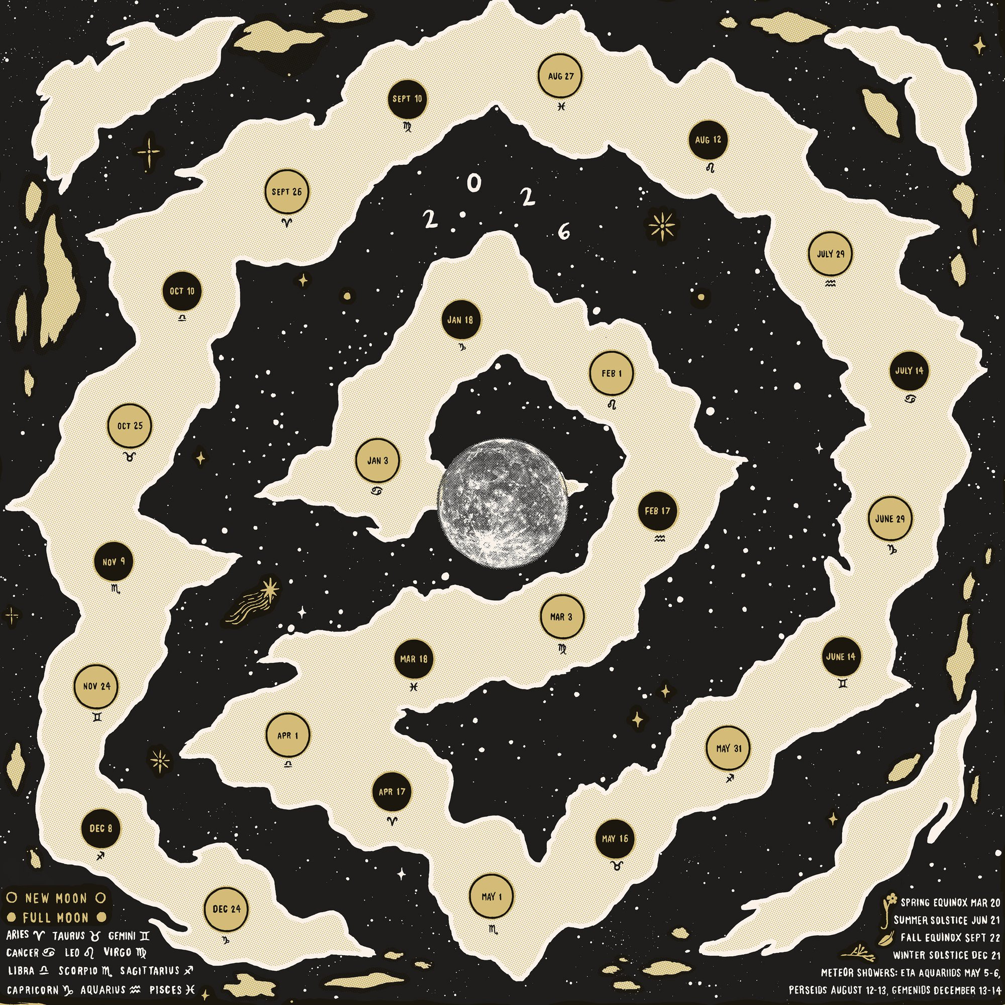 Use this Lunar Calendar to set intentions / stay in touch with the shifting seasons / plan the growing of crops. You can use the calendar to follow the date & astrological phase of each full and new moon during 2026, as well as important meteor showers and solstices. All dates and times are based on Central Standard Time and made for the Northern Hemisphere.